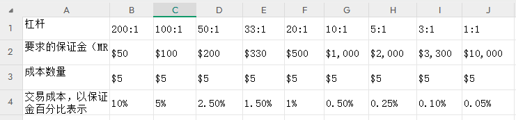 如果你开的是迷你户,交易点差为5,开1手单的成本是5美元,那么从下表中,我们会看到,杠杆越高,相对的交易成本就越大。